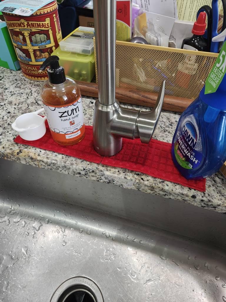 This absorbent mat fits around the neck of your faucet to catch water that drips or splashes there. Keep your counters dry and clean by reducing the amount of standing water.